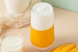 1. 芒果洗淨切塊,果汁機加入綠茶、果糖、一半芒果,低速打勻,再次倒入剩餘芒果塊以及銀耳露攪打3秒。