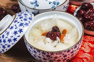 2. 水、銀耳及紅棗煮開後,轉小火煮約50分鐘,再入雪梨塊以及枸杞煮約10分鐘,最後加入冰糖拌勻即可。